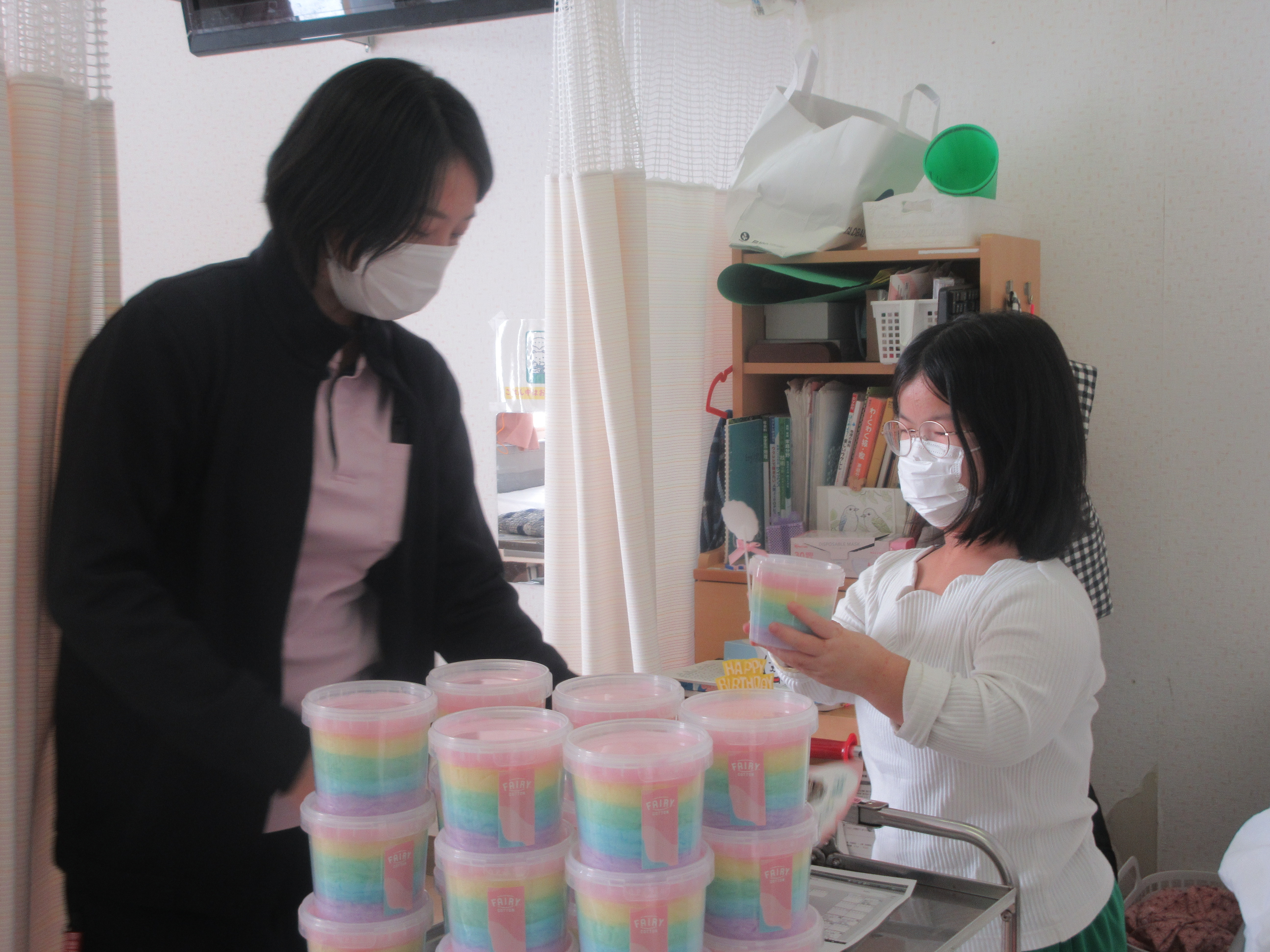 虹色の甘くていい匂いの綿あめは大好評でした!
